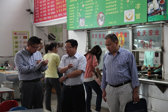 李建华校长来到朝阳校区教工食堂和学生食堂,与正在用餐的老师和学生以及工作人员进行了交流,就餐饮工作提出几点要求,一是做好预案,保障开学高峰时广大师生的就餐;二是提高饭菜质量、稳定餐饮价格,保证低档菜肴的供应比例;三是切实搞好饮食卫生,确保师生用餐安全;四是希望广大同学能够文明就餐,养成良好习惯。