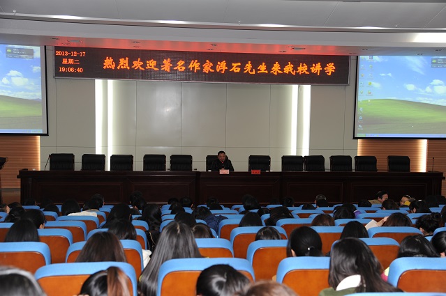 简短的受聘仪式结束后,浮石作了题为“读书改变人生”的讲座。“请在座的同学拿起手中的手机摇一摇,看能不能找到浮石老师。”别开生面的一句开场白引得大家笑声一片。浮石结合自身实际,以本人读大学、留校任教、下海经商、进看守所、文学创作、影视编剧的人生经历,告诉大家要深入生活,热爱生活,笑对生活。浮石幽默风趣的语言、富有激情的演讲,博得在场师生阵阵热烈的掌声。