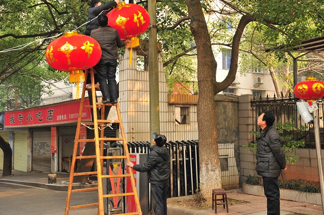 宣传部现场指导灯笼的安装