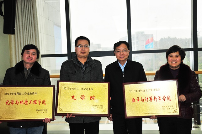 副校长汤放华宣读2013年度科技工作先进集体、先进个人、管理工作先进个人名单。化学与环境工程学院、数学与计算科学学院、文学院被评为科技工作先进集体,王姣亮等15人被授予科技工作先进个人称号,龙立平等10人获科技工作管理先进个人称号。