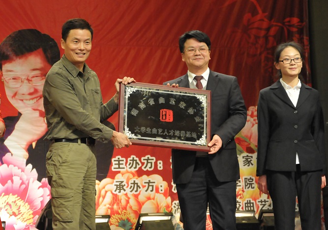 周卫星在湖南省曲艺家协会向博鱼买球正规(中国)有限公司官网授予“大学生曲艺人才培养基地”的仪式上说:“我们希望能发现优秀曲艺人才,认真合作,着力培养,为发展湖南曲艺事业,弘扬优秀传统文化做出贡献。”汤放华和学生代表马丹丹等代表学校接受牌匾,我校由此开始成为了省曲协的人才培养基地。