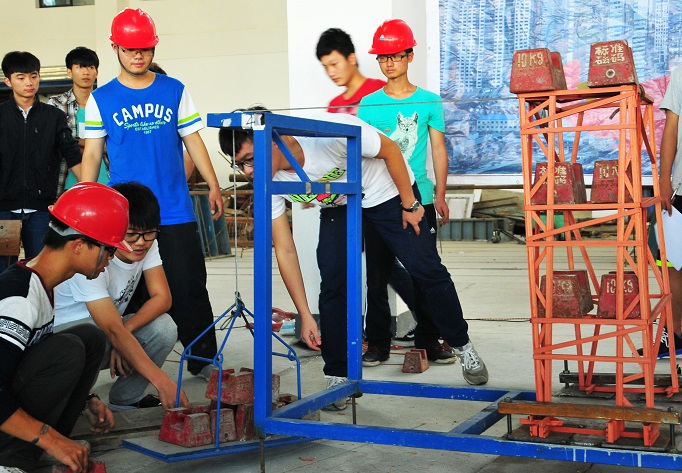 比赛现场, 6位专家评委现场观摩了模型加载实验过程。在加载实验过程中,所有模型都要在加载器内接受竖向加载和横向加载。荷载加上去后20秒以内模型坍塌以及模型位移超过标准均属失败。