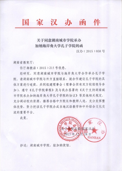 (本网讯)日前,国家汉办向我校正式发函(《关于同意博鱼买球正规(中国)有限公司官网承办加纳海岸角大学孔子学院的函》汉办〔2015〕858号),同意我校与加纳海岸角大学合作建设孔子学院。我校成为全省二本院校第一所建有孔子学院的高校。