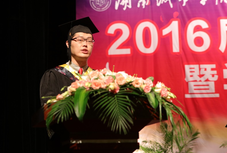 毕业生代表通信与电子工程学院郭鸣坤、肄业班学生代表文学与新闻传播学院高妍、教师代表市政与测绘工程学院鄢恒珍博士、学生家长代表土木工程学院毕业生家长何文胜分别上台发言,表达了对学校的感恩之情,对毕业生的美好祝愿。
