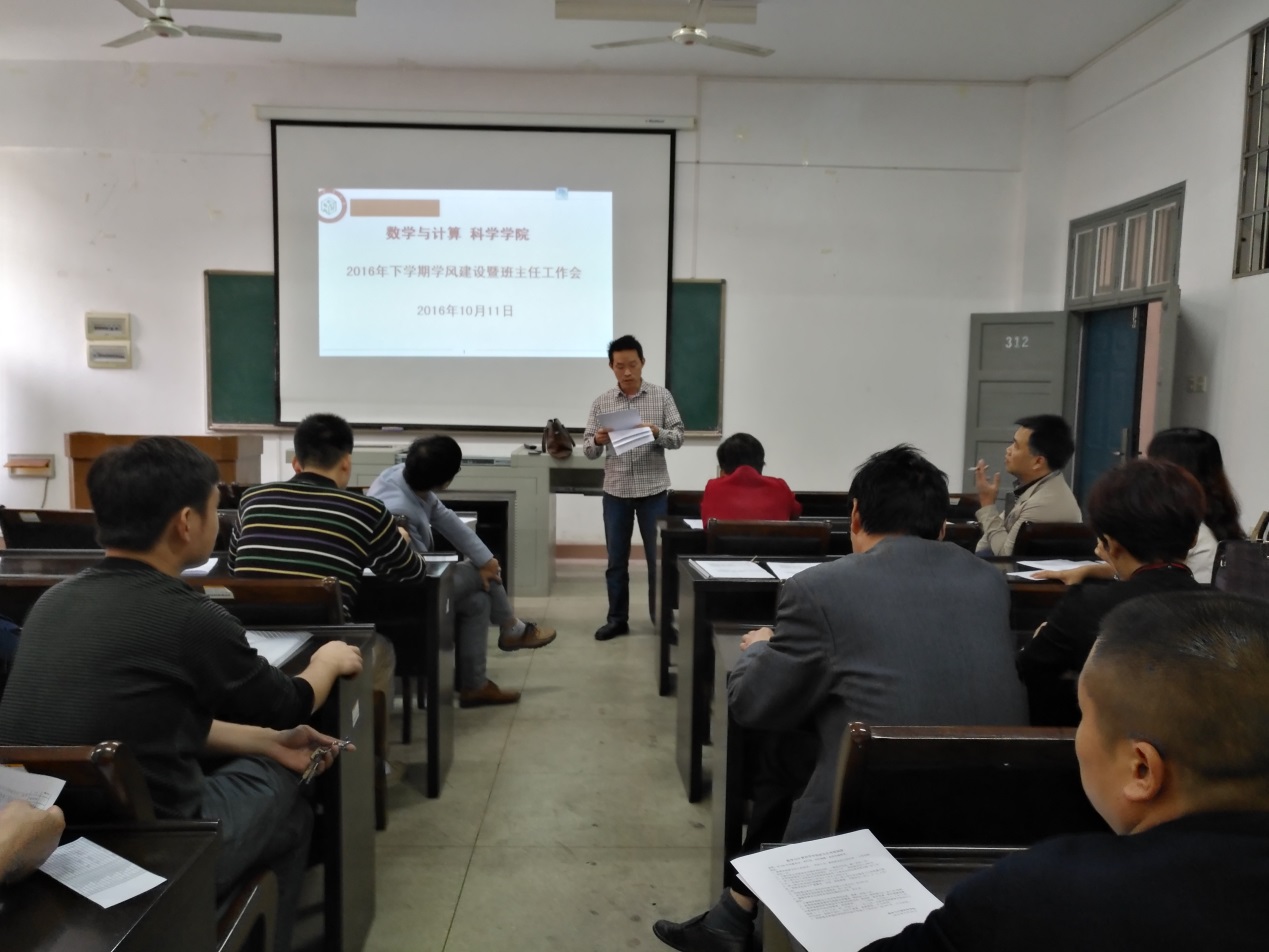 10月11日下午2点,数学与计算科学学院在该院会议室召开2016年下学期学风建设暨班主任工作会议。该院领导班子、教研室主任、辅导员和班主任参加了会议。
