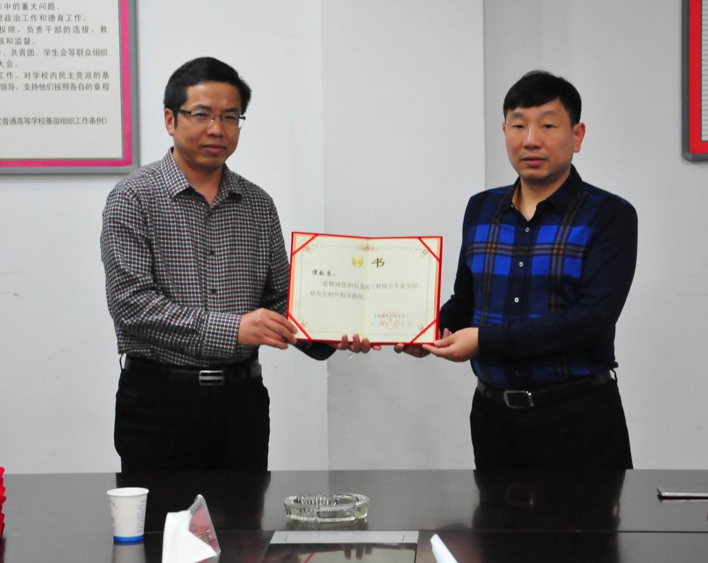 (本网讯)10月17日下午,中南林业科技大学土木工程与力学学院院长陈伯望一行来校,聘任我校七位教师为该校专业硕士导师。聘任仪式在学校办公楼二会议室举行。副校长何振、谭献良出席聘任仪式。