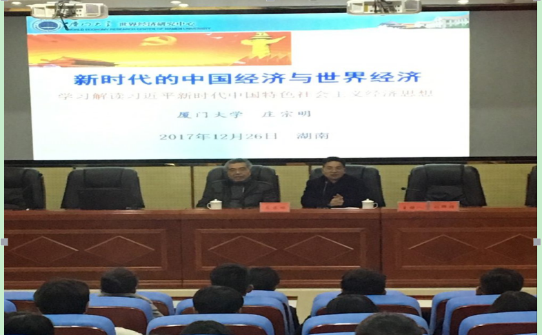 (本网讯)2017年12月26日厦门大学经济学教授、博导,国务院学位委员会委员、学科评议组成员庄宗明教授应邀来校为我校管理学院师生,作了一堂题为“新时代的中国经济与世界经济”的学术报告,并与管理学院教师举行了座谈。党委书记罗成翼,副校长刘辉煌、何振参加了座谈会。