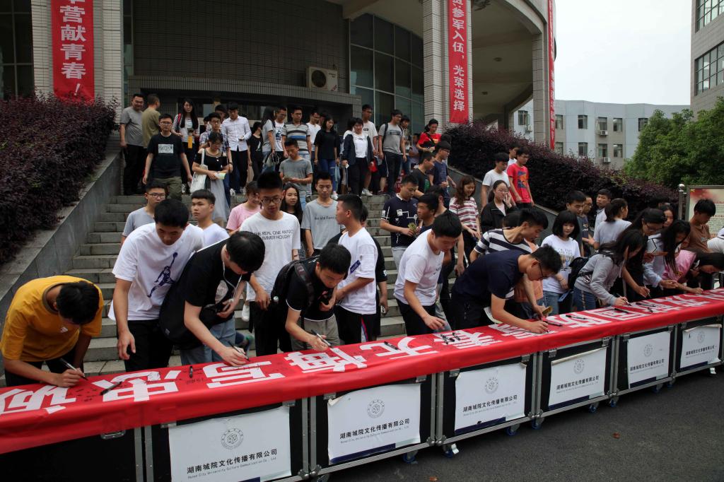 仪式结束后,与会的领导、老师、青年学子在征兵宣传横幅上签字,适龄学子到征兵工作宣传点咨询和领取了相关资料。(文/刘红星 图/博夕)