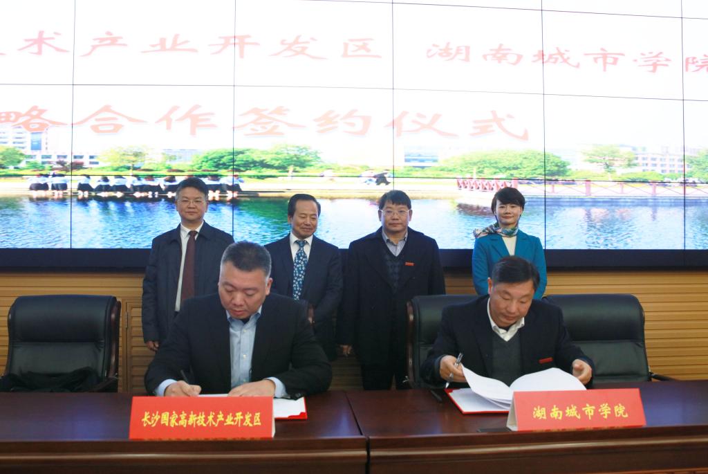 仪式上,党委书记罗成翼首先致辞,他代表学校党委、行政和两万余名师生对出席签约仪式的长沙高新区领导和来宾表示热烈的欢迎。他指出,近年来,我校对接产业、行业,深化教育教学改革和产教融合,推进学科建设,与中核、中建、华为技术有限公司、益阳市深入合作,成效显著。此次校地合作协议的签订,必将为学校的改革发展注入强劲动力,推动我校应用型人才培养、应用型研究迈上新台阶。我们要利用产教融合平台,积极融合长沙高新区的产业集群,并结合学校专业学科特色,在人才培养、政策咨询、应用技术推广等方面发挥自身优势,提供力所能及的服务。我们要以睁开眼睛看世界的情怀,把长沙高新区的创新经验、创新成果和好业态、好技术,融入到我校的教育教学和人才培养过程中去,进一步提高人才培养质量。