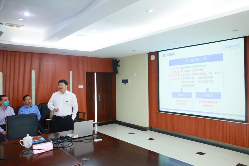 党委书记罗成翼汇报了学校的基本情况、办学成效和办学特色。他说,近年来,学校以“1235”发展战略为引领,以“六破六立”改革为抓手,以大改革推进大发展。一是坚持以本为本,全面振兴本科教育,本科教学审核评估获高度评价;二是强力推进师资队伍建设,高层人才队伍取得长足进步,涌现出一批全国优秀教师、121人才工程人选等优秀人才;三是对接行业产业,深度产教融合,应用型人才培养特色鲜明;四是集成资源,抢抓项目、平台,各项关键性可比核心指标明显进位,综合实力进入同类高校前列;五是以政治建设为引领,抓实党建,构建班子四力、干部六(八)条、基层二三五工程的符合学校实际的党建话语体系。同时,罗成翼还就学校发展中的问题和短板进行了汇报,并恳请省教育厅继续对我校建设发展给予大力支持。