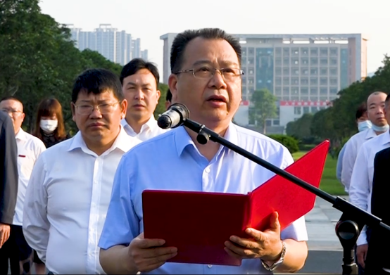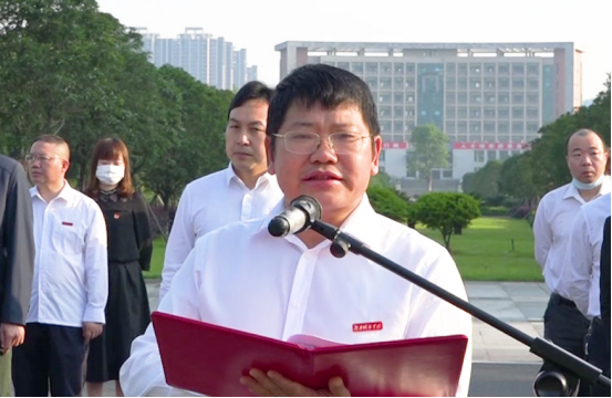 本网讯 2020年5月11日清晨,我校举行2020年春季学期返校复学后的首次升旗仪式。此次升旗仪式采用了“线上+线下”方式,全体校领导,相关处室负责人,二级学院党委书记、副书记、团委书记等参加现场升旗仪式,全体学生分别在宿舍或家中通过“云直播”的方式参加线上升旗仪式,共同感受这场特别的“开学礼”。校长李建奇主持升旗仪式。
