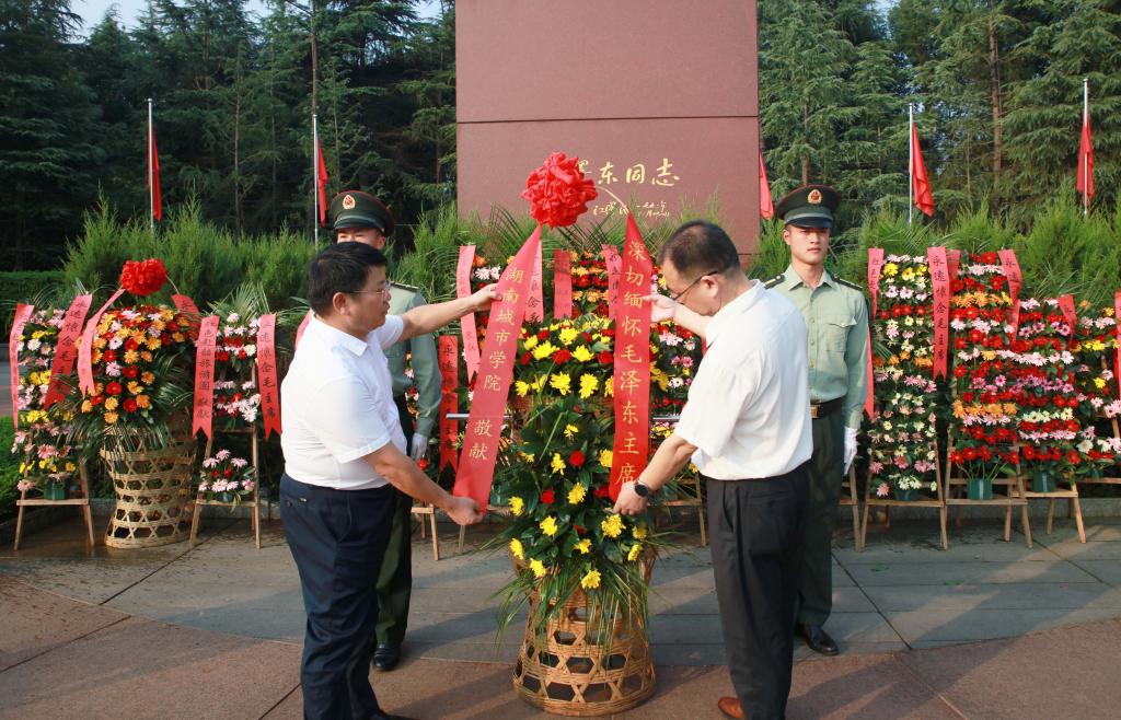 向毛泽东同志铜像敬献花篮。