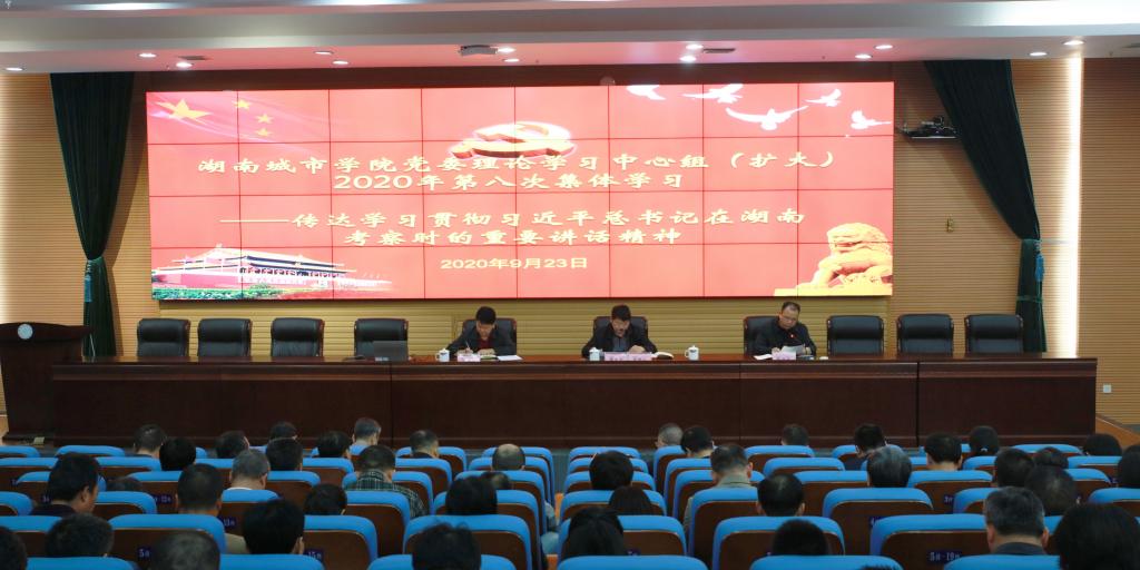 (本网讯)2020年9月23日,学校召开党委理论学习中心组(扩大)第八次集体学习,专题传达学习习近平总书记在湖南考察调研时的重要讲话精神和省委常委会扩大会议精神,全面部署贯彻落实工作,为奋力谱写新时代中国特色社会主义湖南新篇章贡献城院力量。校长李建奇领学了《习近平在湖南考察时强调:在推动高质量发展上闯出新路子 谱写新时代中国特色社会主义湖南新篇章》《湖南省委常委会扩大会议传达学习贯彻习近平总书记在湖南考察时的重要讲话精神》,党委副书记汤放华领学了《习近平:在基层代表座谈会上的讲话》。副处级(含)以上干部、学生辅导员、马克思主义学院全体教师参加会议。党委书记罗成翼主持会议并作重要讲话。