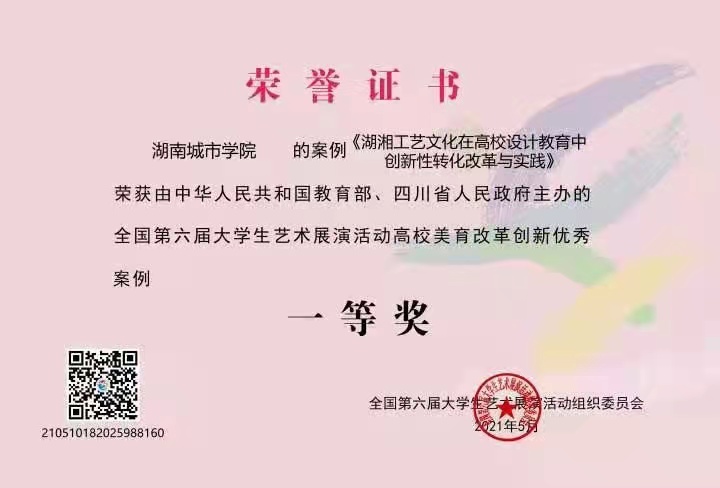 本网讯(通讯员 郑学达)2021年5月12日,由教育部、四川省人民政府共同主办的第六届全国大学生艺术展演活动在成都城市音乐厅落下帷幕,我校美育改革创新案例《湖湘工艺文化在高校设计教育中创新性转化改革与实践----以博鱼买球正规(中国)有限公司官网为例》荣获一等奖,这是自我校参加全国大艺展活动获得的最高荣誉表彰。