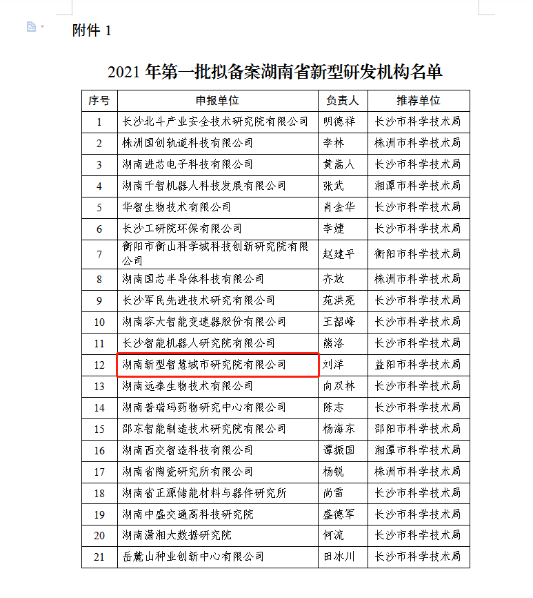 本网讯(通讯员 李娜)2021年7月5日,湖南省科学技术厅发布了《关于2021年第一批湖南省新型研发机构备案及培育名单的公示》,湖南新型智慧城市研究院有限公司(简称“研究院”)作为益阳市唯一一家企业上榜。