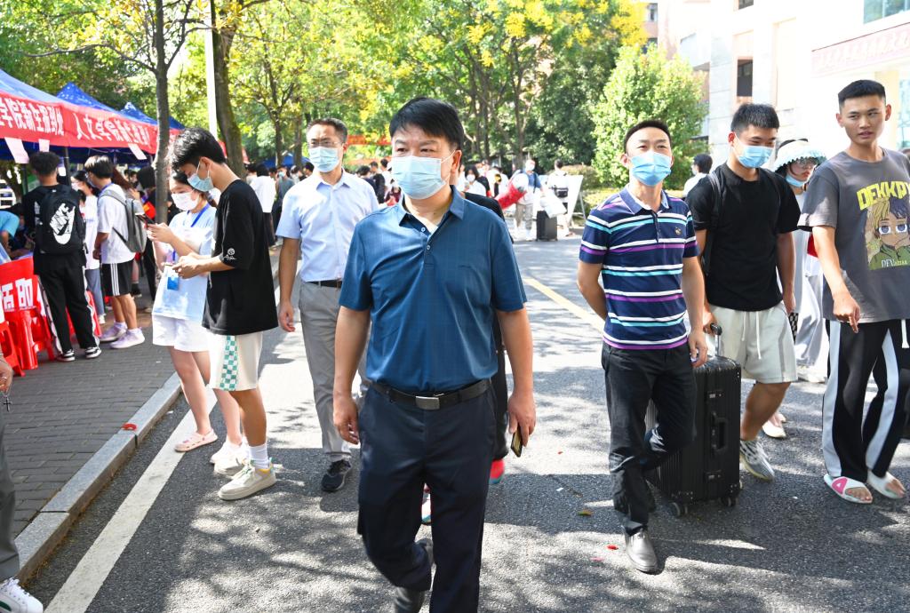 校长汤放华走访迎新现场。
