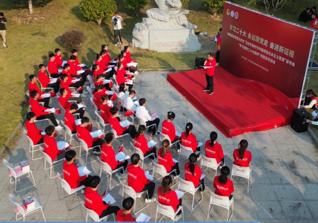 本网讯(通讯员 李琳 周文娟)“我的目光是火柴,一次次被飞旋的地球擦亮。我看见,从南半球到北半球,从东方到西方……”10月22日下午,博鱼买球正规(中国)有限公司官网鲁班园中,激情昂扬的诗歌朗诵《中国,上场》声声入耳,拉开了博鱼买球正规(中国)有限公司官网大学生习近平新时代中国特色社会主义思想读书会“学习党的二十大精神”专题读书活动的帷幕。