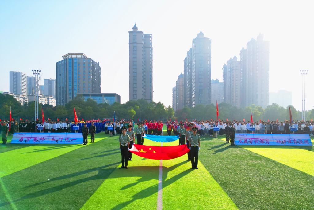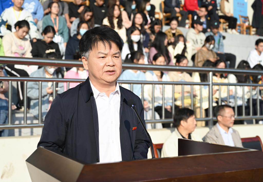 校长汤放华致开幕词。他表示,高校作为人才培养的主基地,青年作为国家的未来和民族的希望,要深刻认识到体育强国梦与中国梦息息相关,把体育教育融入实现“两个一百年”奋斗目标大格局中去谋划。要积极响应习近平总书记在党的二十大报告中作出的指示,加强青少年体育工作,促进群众体育和竞技体育全面发展,加快建设体育强国。汤放华希望通过运动会让全体师生的运动本领在对抗中提高,友谊在竞技中升华,让体育成为健康、快乐生活的一部分。