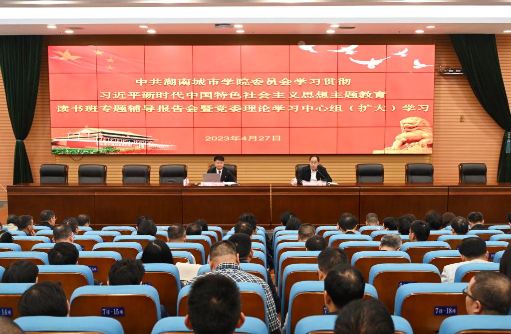 本网讯(通讯员 周文娟)4月27日下午,博鱼买球正规(中国)有限公司官网学习贯彻习近平新时代中国特色社会主义思想主题教育读书班专题辅导报告会暨党委理论学习中心组(扩大)2023年第4次集体学习在图书馆报告厅举行。校党委书记汤放华作专题辅导报告,主题教育第三十巡回指导组组长、益阳市第五届人大常委会主任、省人大财经委原副主任委员徐云波同志,主题教育第三十巡回指导组副组长、湖南工业大学原副校长李可兴同志以及巡回指导组其他成员出席会议。校党委副书记、校长何振主持会议,全体校领导、全校副科以上干部参加会议。