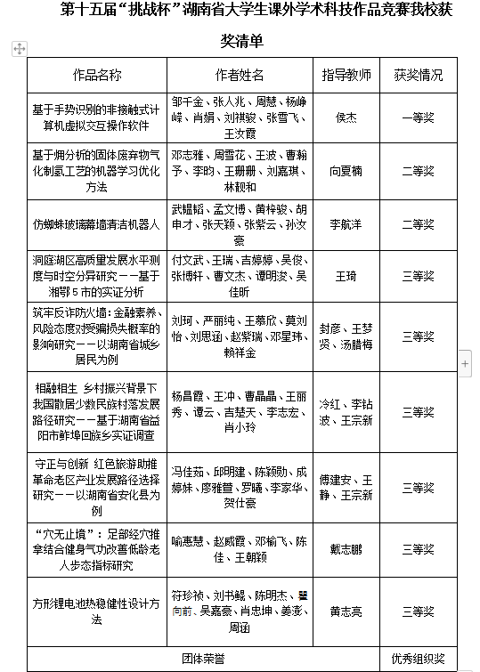 我校在第十五届“挑战杯”湖南省大学生课外学术科技作品竞赛中喜获佳绩