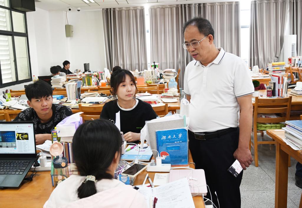 随后,何振一行检查了食堂和图书馆。“请问你学的是什么专业?准备报考哪所学校?”在图书馆考研自习室,何振与暑期留校考研的各位学子亲切交谈,了解他们的考研准备情况,询问其学习生活是否还存在困难,勉励他们坚定目标、增强信心,既要全力以赴、勤下苦功,又要劳逸结合、合理备战。