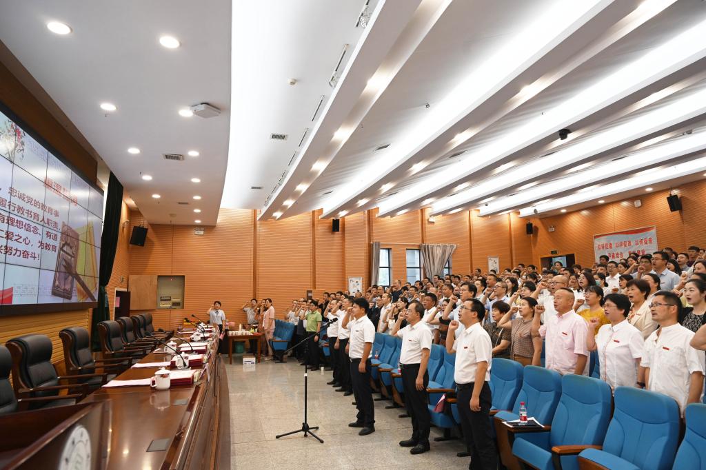 大会在庄严的国歌声中拉开帷幕。“我志愿成为一名人民教师,忠诚党的教育事业……”全体人员在汤放华的带领下,高举右手,郑重宣誓。铮铮誓言响彻校园,也在教职工心间激起阵阵共鸣。