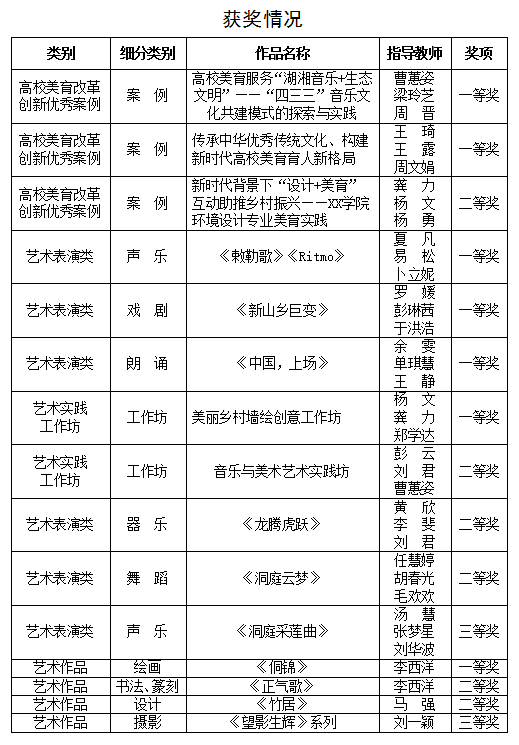本网讯(通讯员 刘华波)近日,湖南省教育厅正式公布湖南省第七届大学生艺术展演活动评选结果。经过激烈角逐,我校代表队凭借精湛的技艺和富有创意的作品,在众多参赛队伍中脱颖而出,共有15项作品及案例获奖,其中一等奖7项、二等奖6项、三等奖2项。