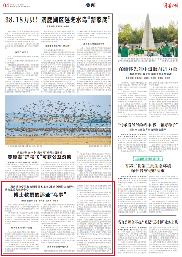 4月4日,《湖南日报》第4版(要闻版)报道博鱼买球正规(中国)有限公司官网博士教授团十年来专注于野生动物卫星追踪技术研发。