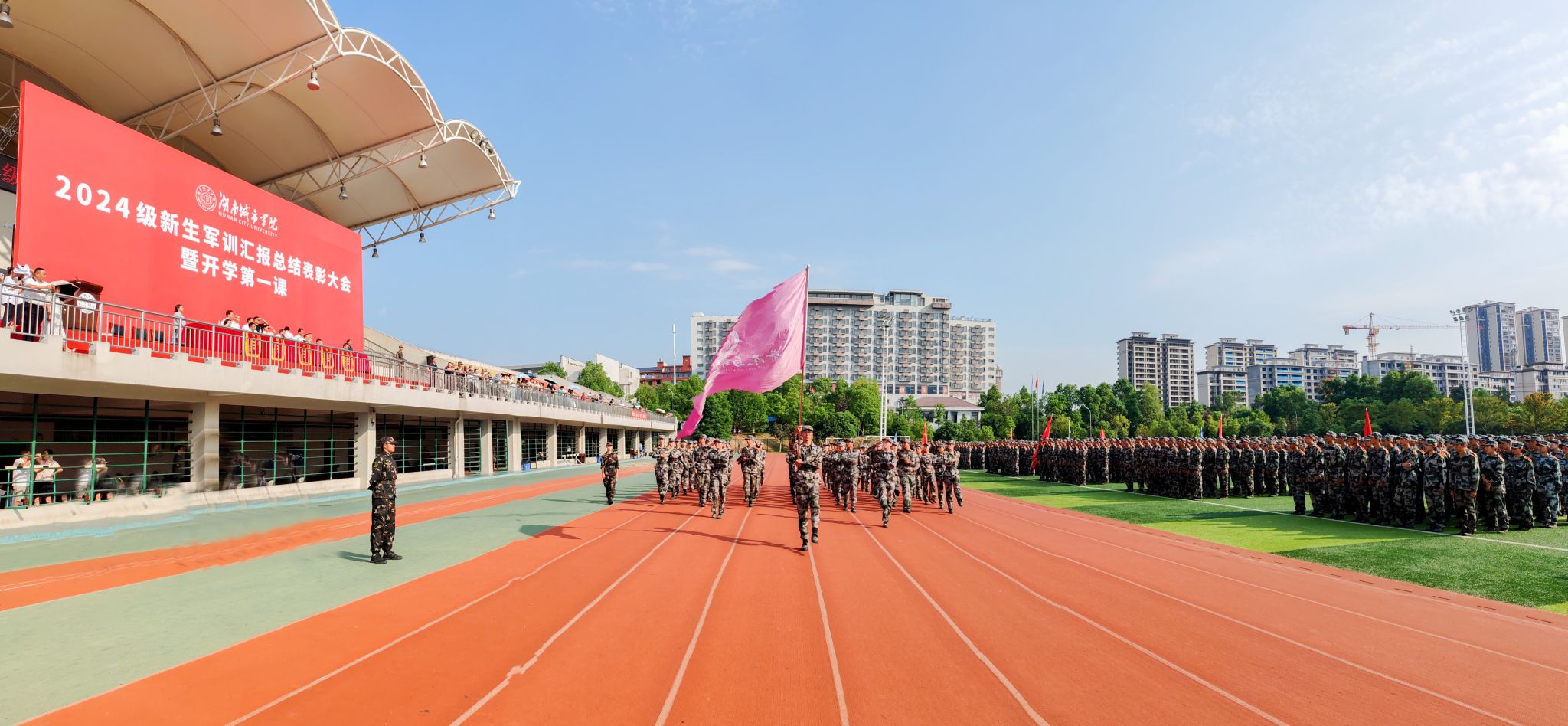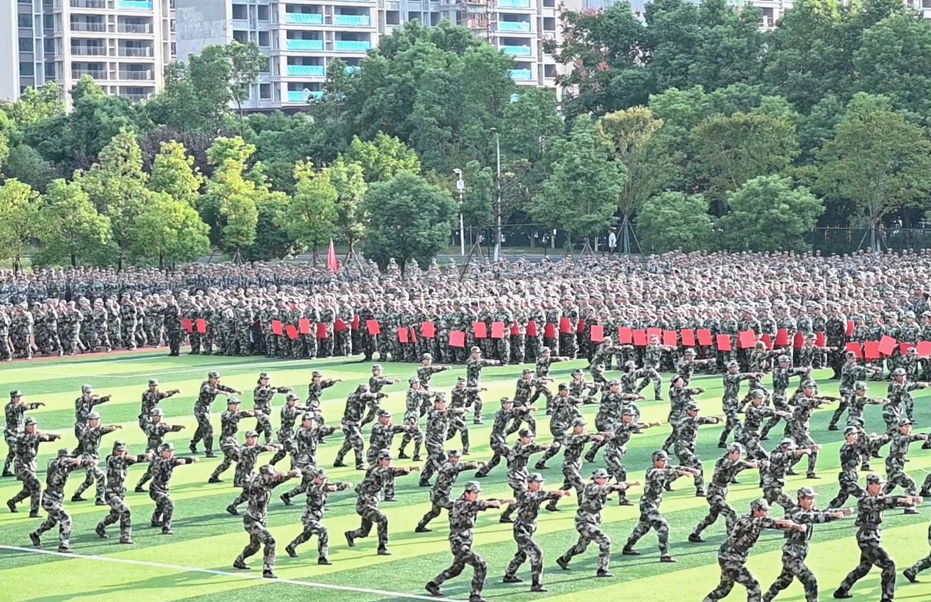 本网讯 9月30日上午八时,博鱼买球正规(中国)有限公司官网2024级新生军训汇报总结表彰大会暨开学第一课在学校东田径场举行。全场新生身着全套迷彩,整装待发,以最好的精神风貌迎接来自各方的检验。全体在家校领导出席大会。校长何振宣布军训成果汇报表演正式开始,副校长雷存喜主持大会。
