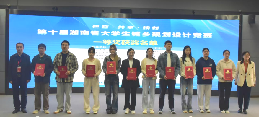 会上,雷存喜对各参赛高校和获奖选手表示衷心感谢和诚挚祝贺,并寄语同学们发挥专业所长,自觉助推和服务国家新型城镇化和乡村振兴战略。周军在讲话中指出,本次竞赛是湖南省城乡规划教育成果的一次集中展示,促进了各高校之间的交流与合作,推动了城乡规划教育教学质量的提升。张成智详细解读了竞赛题目,并对获奖作品表示肯定,鼓励选手们再接再厉,继续保持对专业的热爱和追求。随后,与会领导为获奖单位和获奖者颁奖。