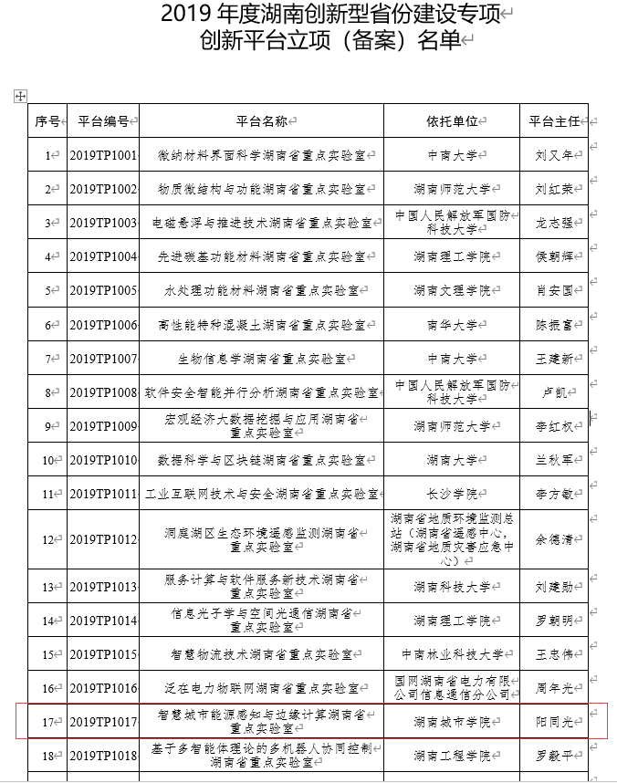 2019年12月19日,湖南省科学技术厅发布了《关于2019年度湖南创新型省份建设专项创新平台立项(备案)的通知》,学院智慧城市能源感知与边缘计算湖南省重点实验室成功入选。