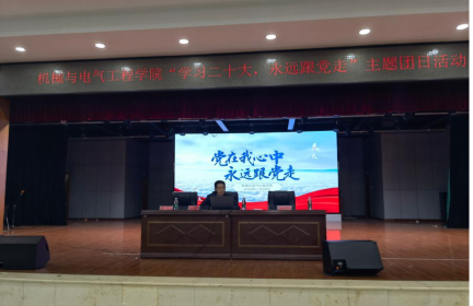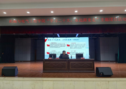 2022年11月28日晚19点我院在新食堂三楼活动中心开展党在我心中,永远跟党走主题团课,本次团课由机械与电气工程学院党委副书记易志明授课,我院团委学生会全体学生干部、21级和22级全体班长及团支书共同参与。