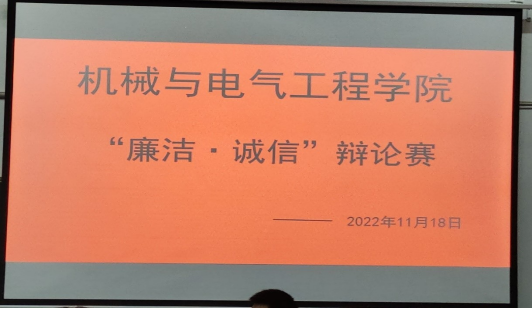 2022年是党的二十大召开之年,为了学习领会党的二十大精神,增强同学们的爱党爱国情怀,提高同学们的政治觉悟,弘扬优秀传统文化,机械与电气工程学院于20221118日在一教410举行“廉洁·诚信”主题辩论赛。