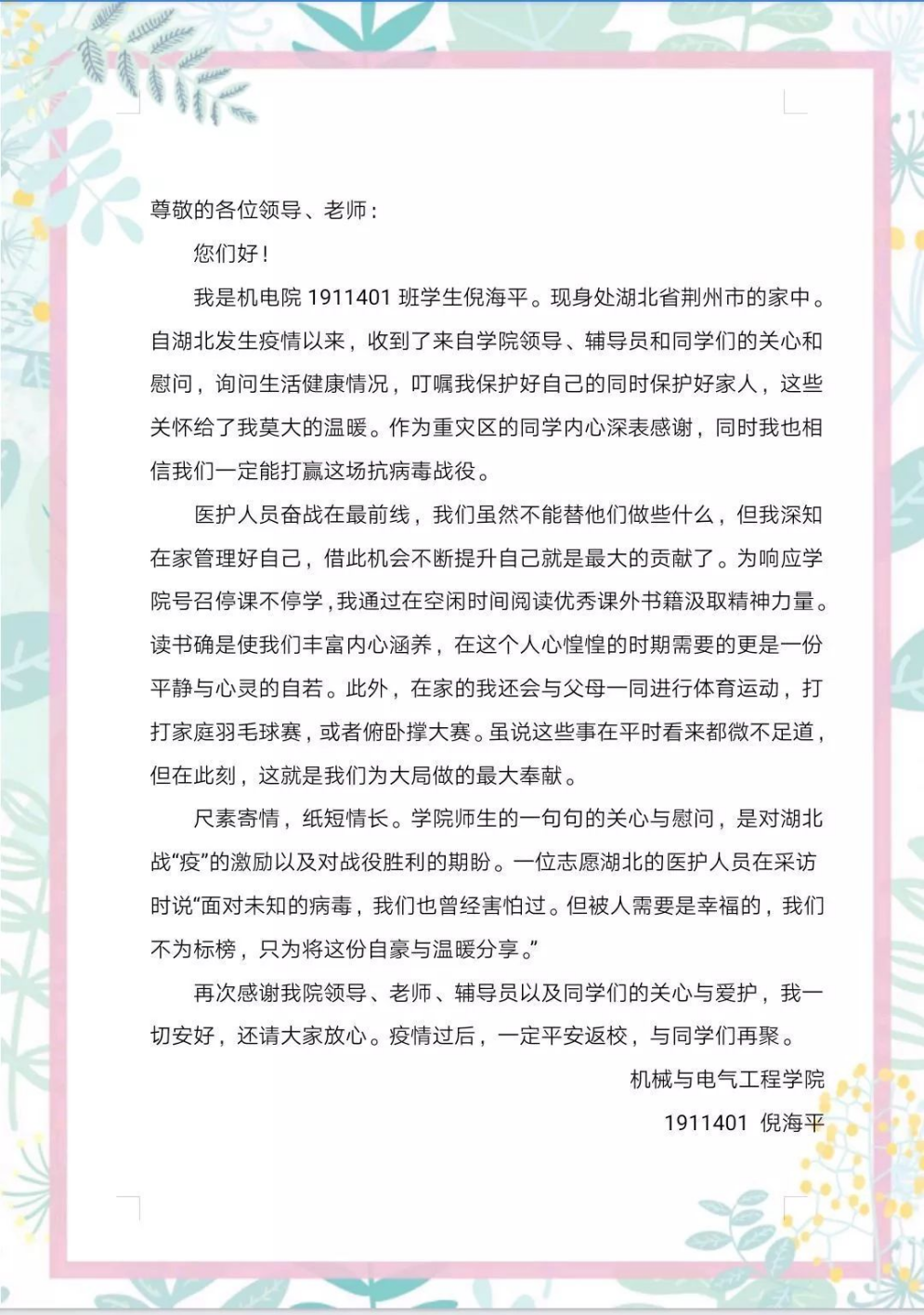 同心协力、英勇奋斗、共克时艰,2月13日,博鱼买球正规(中国)有限公司官网机械与电气工程学院党总支书记徐畅贤、院长阳同光与学子紧密联系,并代表学院通过信件向身在抗击疫情前线的湖北籍学生送去学院的关怀和问侯。